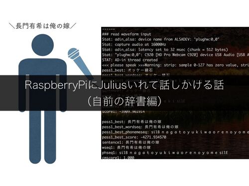* つまりなにしたの? RaspberryPiにJulius入れてとりあえず既存のディクテーションキットで話しかけられるようにする。 今日はJuliusをインストールして好き勝手な言葉を話しかけて文字列にしてもらう。